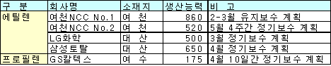 LG화학 대산공장은 3월초부터 4월 중순까지, 삼성토탈은 4월 중순부터 6월 중순까지 정기보수 기간을 이용해 Debottlenecking을 전개할 계획이다.
