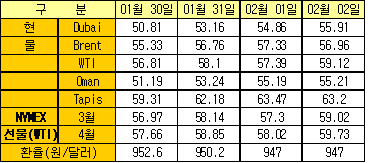 2월2일 WTIㆍBrent 59달러 안팎 형성 … Dubai유도 55.91달러 기록 2월2일 국제유가는 미국 동북부 지역의 추운 날씨 예보와 나이지리아의 파업 예정 등으로 상승했다.한국석유공사에 따르면, 뉴욕상업거래소(NYMEX)의 WTI(서부텍사스 중질유) 선물유가는 전일대비 배럴당 1.72달러 상승한 59.02달러에, ICE의 Brent 선물유가는 1.69달러 상승한 58.41달러에 거래를 마감했다. Dubai 현물유가는 미국의 천연가스 재고 발표 영향이 뒤늦게 반영되면서 1.05달러 상승한 55.91달러를 형성했다.