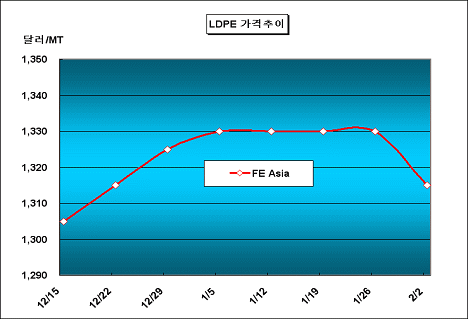 CFR FE Asia 1310-1320달러로 15달러 하락 … Formosa 풀가동 LDPE(Low-Density Polyethylene) 가격은 1월31일 CFR FE Asia 톤당 1310-1320달러로 15달러 하락했다.아시아 LDPE 시장은 수급이 타이트함에도 불구하고 에틸렌 가격 하락세의 영향을 받아 4주만에 약세로 돌아섰는데, 중국 수출가격도 CFR China 톤당 1320달러로 10달러 정도 떨어졌다. 그러나 타이완 Formosa가 EVA(Ethylene Vinyl Acetate) 및 LLDPE(Linear LDPE) 생산에 치중하기로 결정하고 에틸렌 가격급등으로 PE 가동률 조정이 잇따르는 등 수급타이트가 계속될 것으로 보여 반등 가능성도 엿보이고 있다. Formosa는 Mailiao 소재 LDPE/EVA 스윙 24만톤, HDPE(High-Density PE) 35만톤, LLDPE 26만4000톤 플랜트를 가동하고 있다.