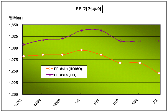 CFR FE Asia 1240-1250달러로 23달러 떨어져 … 중국 저가오퍼 중단 PP(Polypropylene) 가격은 1월31일 Raffia/Injection 그레이드가 CFR FE Asia 톤당 1240-1250달러로 하락했다.아시아 PP 시장은 중국의 구매수요가 부진을 면치 못함에 따라 하락세를 보이고 있으며, 2007년 들어 극동아시아 및 동남아시아 가격이 톤당 60달러, 남아시아 가격은 17-18달러 하락했다. 다만, WTI(서부텍사스 중질유) 가격이 배럴당 60달러에 육박하는 등 강세로 전환돼 곧 상승세를 보일 것이라는 전망도 대두되고 있다. 특히, 중국의 PP 생산기업들이 낮은 가격의 오퍼를 중단해 아시아 시자에 영향을 미치고 있는데, 중국 내수가격은 Raffia/Injection 그레이드가 ex-Work 기준 톤당 1만1800-1만1900위안을 형성했다.