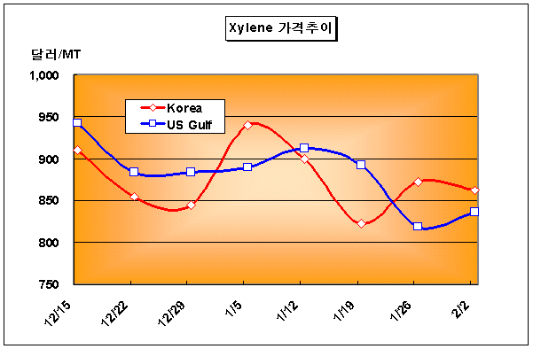 FOB Korea 1093-1097달러 형성 … 한국ㆍ일본 정기보수로 강세 전망 P-X(Para-Xylene) 가격은 2월2일 FOB Korea 톤당 1093-1097달러로 35달러 하락했다.아시아 P-X 시장은 국제유가가 WTI(서부텍사스 중질유) 기준 배럴당 60달러 수준으로 강세를 보이고 있음에도 불구하고 수요가 약세를 보이면서 1월 셋째주에 이어 또다시 1100달러 아래로 떨어졌다. PTA 가격이 약세를 보이면서 채산성 악화로 P-X 수요가 줄어들고 있기 때문이다. 하지만, 2/4분기에 한국 및 일본의 정기보수가 예정돼 있어 머지않아 강세로 전환될 가능성이 제기되고 있다. 이에 따라 Nippon Oil과 Idemitsu, ExxonMobil 등이 아직도 2월 아시아 계약가격을 결정하지 못하고 있는 것으로 알려졌다. 다만, Japan Energy는 2월 계약가격을 CFR Asia 톤당 1030달러로 고시했다. M-X(Mixed-Xylene) 가격은 생산기업들이 FOB Korea 톤당 870달러를 요구했으나 수요처들은 850달러를 제시한 것으로 알려졌다.