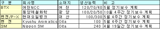 일본 Nippon Steel Chemical의 Hirohata 소재 벤젠 7만톤 설비는 5월 45일간의 정기보수에, Cyclohexane 4만톤 설비는 6월 20일간의 정기보수에 들어갈 예정이다.