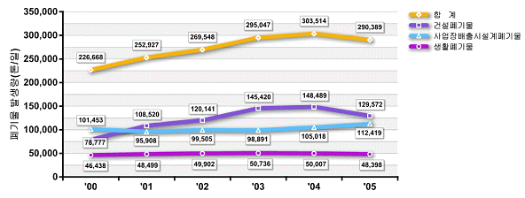전국 평균 1인당 1일 생활폐기물 발생량은 2004년 1.03kg에서 2005년 0.99kg으로 줄어 미국(2.00kg), 영국(1.59kg), 일본(1.12kg) 및 OECD 30개국 평균 1.56kg보다 낮은 수준을 기록했다. 생활폐기물 중 음식물ㆍ채소류의 1인당 1일 발생량은 0.27kg으로 2004년(0.24kg) 대비 30g 증가했는데, 2005년 1월 음식물 쓰레기의 직매립 금지조치 이후 분리수거 체계의 확립으로 음식물ㆍ채소류의 총 발생량이 1일 1만2977톤으로 2004년(1만1464톤)에 비해 13.2% 증가했기 때문이다. 생활폐기물의 처리방법은 93.8%가 재활용, 매립이 2.5%, 소각이 3.7%로 나타났으며, 재활용 비율은 22% 증가한 반면 매립은 66.8% 감소했다. 사업장 배출시설계 폐기물은 2005년 1일 11만2419톤으로 2004년(10만5018톤)에 비해 무려 7.0% 증가했으며 2003년 이후 지속적으로 증가하는 추세를 보이고 있다. 2005년 산업생산지수가 전기가스 7.1%, 전산업 6.3%, 광공업 6.2%, 제조업 6.2% 증가한 반면 광업만 6.2% 감소했기 때문이다. 전체 폐기물의 발생비중은 건설폐기물(44.6%), 사업장폐기물(38.7%), 생활폐기물(16.7%)로 건설폐기물이 가장 큰 비중을 차지했다. 다만, 건설폐기물은 주택경기 침체와 건설 수주실적 감소로 2004년 1일 14만1000톤 대비 12.7% 감소한 12만9000톤으로 나타났다. 표, 그래프: | 폐기물 발생량 변화 | <화학저널 2007/02/08> |