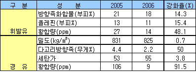 경유의 황함량 기준은 2005년 430ppm 이하에서 2006년 30ppm 이하로 약 1/14 수준으로 강화돼 대기오염 저감은 물론 산성비 방지 등에 크게 기여할 것으로 보인다. 국립환경과학원은 2007년부터 시행되는 자동차연료 품질관리를 위해 연료 제조단계부터 사전검사를 수행함으로써 연료에 의한 대기오염 저감효과를 극대화시킬 계힉이다. 표, 그래프: | 연료 품질강화에 따른 대기오염물질 감소율(2005년 대비 2006년) | 주요 자동차 연료 성분분석 결과 | <화학저널 2007/02/09> |