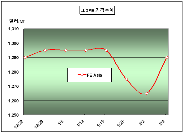 중동산 LLDPE가 FD NWE 톤당 1060유로 수준에 유입될 것으로 예상됨에 따라 수요처들이 구매를 꺼리고 있기 때문이다. 표, 그래프: | LLDPE 가격추이 | <화학저널 2007/02/10> |