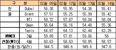 2월14일 55.41달러로 1.05달러 올라 … WTIㆍBrent유는 하락세 전환 2월14일 국제유가는 미국의 중간유분 재고 감소 폭이 당초 예상보다 줄어든 영향이 반영되면서 하락했다.한국석유공사에 따르면, 뉴욕상업거래소(NYMEX)의 WTI(서부텍사스 중질유) 선물유가는 전일대비 배럴당 1.06달러 하락한 58.00달러에, ICE의 Brent 선물유가는 1.35달러 하락한 57.43달러에 거래를 마감했다. 반면, Dubai 현물유가는 국제에너지기구(IEA)의 세계 석유 수요 상향조정 소식 등이 뒤늦게 반영되면서 1.05달러 상승한 55.41달러를 형성했다.