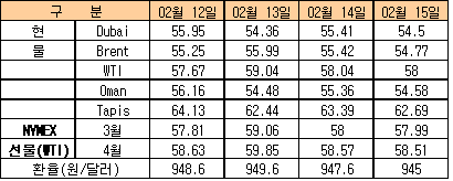 2월15일 0.91달러 떨어져 … WTI 약보합세에 Brent는 강보합세 2월15일 국제유가는 미국 동북부 지역의 날씨가 온화할 것으로 예보되는 가운데 약보합세를 형성했다.한국석유공사에 따르면, 뉴욕상업거래소(NYMEX)의 WTI(서부텍사스 중질유) 선물유가는 전일대비 배럴당 0.01달러 하락한 57.99달러에, ICE의 Brent 선물유가는 0.17달러 상승한 57.60달러에 거래를 마감했다. Dubai 현물유가는 0.91달러 하락한 54.50달러를 형성했다.
