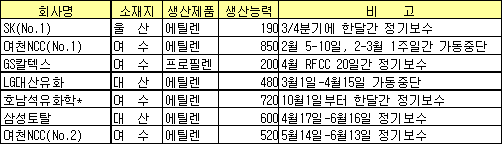 한편, 호남석유화학은 10월 한달간 여수 소재 72만톤 크래커를 정기보수할 예정이다. 표, 그래프: | 국내 올레핀 플랜트 가동현황(2007) | <화학저널 2007/02/16> |