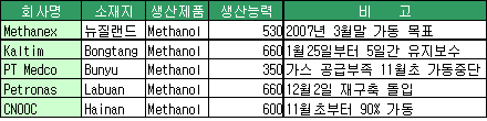KaltimㆍPetronas 트러블 발생으로 가동차질 … Methanex는 3월 가동 아시아의 메탄올(Methanol) 수급타이트가 좀처럼 풀릴 기미를 보이지 않고 있다.메탄올 플랜트의 트러블에 따라 자동중단이 이어지고 천연가스 공급부족까지 겹쳐 생산이 원활치 못하기 때문이다. Kaltim은 Bongtang 소재 메탄올 66만톤 플랜트를 2006년 10-11월에 걸쳐 한달간 정기보수를 실시했으나 트러블이 발생해 2007년 1월25일부터 5일간 유지보수를 실시한 것으로 알려졌다. Petronas도 Labuan 소재 66만톤 플랜트에서 2006년 11월20일 기계적 트러블이 발생해 가동을 중단한 후 12월2일 재구축에 들어갔다. PT Medco 역시 천연가스 공급부족으로 Bunyu 소재 메탄올 35만톤 플랜트의 가동을 11월초부터 중단하고 있는 것으로 알려졌다.