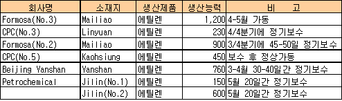 Formosa 120만톤 크래커 4-5월 가동으로 … 중국은 수급타이트 중국은 4-5월 에틸렌(Ethylene) 수급타이트가 예상되는 반면, 타이완은 공급여유가 발생할 것으로 예상된다.Beijing Yashan Petrochemical이 3-4월에 걸쳐 Yanshan 소재 에틸렌 76만톤 크래커의 정기보수를 실시하는데 이어 Jilin Petrochemical이 5월 No.1 15만톤 및 No.2 60만톤 크래커의 정기보수를 동시에 실시할 예정이기 때문이다. 반면, 타이완은 Formosark 4월이나 늦어도 5월에는 Mailiao 소재 에틸렌 No.3 120만톤 크래커를 가동할 예정이고, No.2 90만톤 크래커는 3/4분기에 정기보수를 예정하고 있어 공급 여유가 발생할 것으로 예상된다.