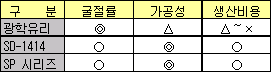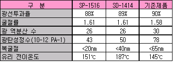 SD는 광학성과 코스트가 적절히 조합된 제품으로 2006년 봄 시장에 투입했으며, 유리 전이온도 180℃ 이상의 고내열성이라는 특징을 지니고 있다. 두가지 소재 모두 내가수분해성에 우수해 장기간 사용해도 성능이 떨어지지 않는다. Teijin은 우수한 광학특성을 갖추고 있으면서도 저렴한 소재로 유리렌즈를 대처할 수 있는 제품으로 연구개발을 진행하고 있으며, 휴대전화의 색수차 보정용 렌즈 등 유리용도와 기존의 PC로는 대응할 수 없던 광학센서와 산업용 렌즈 및 광학용 필름 등 각종 광학부품용으로도 개발하고 있다. 특히, SD는 내열성을 살려 자동차용 카메라용 렌즈를 목표로 하고 있으며, 광학렌즈에 필적하는 고굴절률 실현 등 더욱 향상된 기능을 목표로 하고 있다. 표, 그래프: | Teijin이 신규 개발한 PC의 특성 | 광학유리와 신 PC의 특성 비교 | <화학저널 2007/02/28> |
