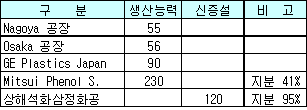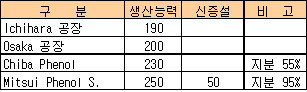 투자액은 페놀과 BPA 총 500억-600억엔에 달할 전망이며 원료가격과 시장동향 등을 예의 주시하면서 2010년 가동 플랜트와 동일부지에 건설할지 분산건설할지 판단할 방침이다. Mitsui Chemicals은 일본 및 싱가폴의 페놀 생산능력이 총 87만톤(병산 아세톤(Acetone) 46만4000톤), BPA는 44만톤으로 모두 아시아 최대의 생산능력을 보유하고 있다. 경쟁우위의 핵심사업인 페놀체인에 경영자원을 집중 투입해 생산규모를 확대하고 코스트 메리트 등을 살려 수익 기반을 강화하기 위한 것이다. 아시아 페놀 수요는 2005년 약 280만톤에 달했고 주 용도인 BPA와 페놀수지(Phenolic Resin) 수요가 꾸준히 신장하고 있어 앞으로도 연평균 7% 신장할 것으로 예상된다.