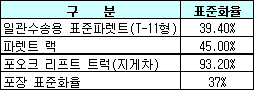 기술표준원, 유럽 90%에 미국 60% … 표준설비 인증제도 개선키로 물류체계의 개선과 물류흐름의 효율성을 제고하기 위해 2004년 7월부터 시행한 물류표준설비 인증제도가 <물류경영시스템 인증제도>로 대폭 개선될 전망이다.기술표준원은 지게차, 컨테이너 등 물류설비에 대해 표준 팔레트(1100mm×1100mm)와의 정합성(整合性) 위주로 평가하는 현행의 물류설비 품목별 인증을 화물 이동과정 전반의 효율성을 평가하는 제도로 개편하고, 품목별 인증평가는 민간전문기관이 수행하도록 하고 정부는 인증심의위원회를 개최해 최종 인증여부만을 결정하는 방향으로 개선키로 했다. 물류경영시스템 인증은 화물의 포장, 운송, 하역, 보관 등에 있어 모든 물류설비가 표준화돼 유닛로드시스템(일관수송체계)을 이루고 있는지 여부, 물류경영시스템 전체가 효과적으로 운용되고 있는지에 대해 평가함으로써 전체 물류흐름의 효율성을 높이기 위한 것이다. 기술표준원은 3월 물류경영시스템 인증기준을 제정해 4월부터 대기업 또는 물류전문기업을 대상으로 시범인증을 실시하고 문제점을 보완해 늦어도 10월부터는 본인증을 실시할 예정이다. 물류설비에 대한 표준화율은 지게차가 93% 이상으로 거의 표준화됐으나 T11형 팔레트를 비롯한 대부분의 물류설비는 평균 약 40%에 그치고 있다.
