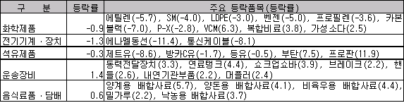 한국은행, 2월 에틸렌ㆍSMㆍ벤젠 크게 떨어져 … 춘절연휴 영향 2007년 2월 생산자물가는 전월대비 0.2%, 전년동월대비 1.7% 상승했다.한국은행이 3월8일 발표한 2월 생산자물가 동향에 따르면, 2월 생산자물가는 비철금속 국제가격 하락 등의 영향으로 공산품(-0.2%)이 내림세를 보였으나, 명절 수요증가로 농림수산품(3.8%)이 오르고 자동차보험료 인상 등으로 서비스(0.1%) 및 전력ㆍ수도ㆍ도시가스(0.3%)가 올라 전월대비 0.2% 상승했다. 공산품은 비철금속 등 원자재 국제가격 하락 및 수요부진 등으로 화학제품, 전기기계ㆍ장치, 석유제품 등이 내려 0.2% 하락했다. 화학제품은 중국의 춘절연휴에 따른 수요 부진 및 재고 증가로 에틸렌(Ethylene), SM(Styrene Monomer), 벤젠(Benzene) 등이 내려 0.9% 하락했다. 석유제품도 LPG 도입가격 상승으로 부탄가스, 프로판가스가 올랐으나, 중국수요 부진 및 기온상승 영향으로 제트유, 방카C유 등이 내려 0.3% 떨어졌다.