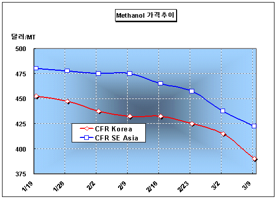 CFR Korea 385-395달러로 25달러 하락 … Zagros 170만톤 가동 돌입 메탄올 가격은 3월8일 CFR Korea 톤당 385-395달러로 25달러 하락했다.아시아 메탄올 시장은 중국의 Formaldehyde 플랜트 가동률이 급락하면서 중국의 메탄올 수요가 크게 줄어들어 오랜만에 400달러가 붕괴됐다. 이에 따라 중국의 메탄올 생산기업들은 FOB China 톤당 390달러 수준에서 수출하기 위해 노력하고 있으나 수요기업들이 CFR 310달러 이하를 요구해 거래가 성사되지 못했다. 중국의 메탄올 내수가격도 동부지역 기준으로 ex-Tank 톤당 3100위안으로 100위안 하락했는데, 수입가격 기준으로는 톤당 310달러 수준이다.