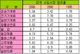 KOTRA, 미국시장 점유율 중국ㆍ일본에 밀려 … 패러다임 변하 시급 수출시장 가운데 전략적으로 가장 중요한 미국에서 한국의 경쟁국 대비 수출정체와 점유율 하락이 심각한 상태이며 특단의 대책이 필요하다는 지적이 제기됐다.KOTRA가 3월11일 발표한 <미국시장 점유율 하락과 한-미 자유무역협정(FTA) 활용방안> 보고서에 따르면, 미국에 대한 수출이 경쟁국들에 비해 부진한 것은 미국시장의 최근 경향을 따라잡지 못하고 경쟁력마저 뒤처지기 때문으로 미국시장 점유율을 회복하기 위해서는 패러다임의 전환이 필요한 것으로 지적된다. 한국의 미국수출은 2005년 5.2% 감소해 20대 미국수출국 중 유일하게 마이너스 성장을 기록한데 이어 2006년에도 증가율이 4.7%에 그쳐 중국(20.9%)과 일본(7.2%)에 크게 뒤졌다. 이에 따라 미국 수입시장에서 한국제품의 점유율은 1989년 4.2%를 정점으로 2000년 3.3%, 2003년 2.9%, 2006년 2.5%로 지속적으로 하락하고 있다. 또 10대 수출품목 가운데 운송기계와 고무제품을 제외한 대부분의 점유율이 중국에 이미 추월당했고 전기기계류와 일반기계류 등은 말레이지아에도 점유율이 뒤진 것으로 나타났다. 미국수출이 부진한 것은 수요측면을 등한시하고 품질, 가격 중심의 공급 일변도 마케팅을 고집하는 등 미국 시장의 변화추세를 따라잡지 못했기 때문이다.