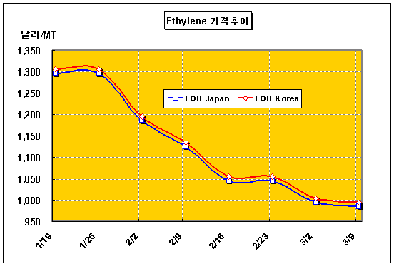 FOB Korea 990-1000달러로 10달러 하락 … 중국ㆍ타이완 재고 넘쳐 아시아 에틸렌(Ethylene) 시장이 공급과잉 현상을 보이며 1000달러가 무너졌다.에틸렌 가격은 3월9일 FOB Korea 톤당 990-1000달러로 10달러 하락하며 오랜만에 1000달러의 마지노선이 무너졌다. 중국과 타이완에서 에틸렌 재고가 넘쳐나고 있기 때문이다. 타이완의 CPC(Chinese Petroleum)는 최근 나프타(Naphtha) 베이스 No.5 에틸렌 45만톤 크래커의 가동률을 90% 수준으로 감축한 것으로 알려졌다. 부타디엔(Butadiene) 가격이 공급과잉으로 톤당 1000달러 붕괴가 임박하면서 No.5 부타디엔 플랜트의 가동을 중단한데 따른 것이다. 타이완은 부타디엔이 공급과잉 현상을 보이면서 재고가 좀처럼 줄어들 기미를 보이지 않는 것으로 알려졌다.