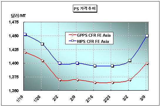 CFR FE Asia 1395-1405달러로 30달러 상승 … 중국 가공기업 풀가동 PS 가격이 3월7일 CFR FE Asia 톤당 1395-1405달러로 30달러 상승했다.아시아 PS 시장은 중국과 홍콩의 바이어들이 구정연휴를 끝내고 본격적으로 구매대열에 합류하면서 GPPS 그레이드 가격이 하락세 6주만에 상승세로 전환 1400달러를 돌파했다. HIPS 가격은 CFR FE Asia 톤당 1445-1455달러로 45달러 급등했다. 중국의 플래스틱 가공기업들이 구정연휴 동안 생산하지 못한 가공제품 생산을 재개했기 때문이다. 이에 따라 GPPS 100-500톤 Cargo가 CFR China 1400-1410달러에, HIPS는 1450-1460달러에 거래된 것으로 알려졌다.