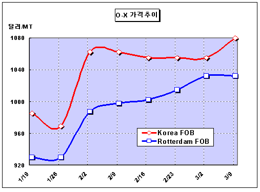 CFR FE Asia 1075-1085달러 형성 … 스윙 플랜트 일부 O-X 포기 아시아 O-X(Ortho-Xylene) 가격이 상승세로 전환했다.O-X 가격은 3월9일 CFR FE Asia 톤당 1075-1085달러를, CFR Japan/China 가격은 1115-1125달러를 형성했다. 전주에 비해 25달러 정도 오른 가격이다. P-X(Para-Xylene) 가격이 또다시 강세를 보임에 따라 일부 스윙 플랜트가 O-X 생산을 포기하고 P-X 생산으로 전환했기 때문이다. 국내에서는 3월 거래되는 3000톤 Cargo가 FOB Korea 톤당 1080달러에 거래됐고, 인도네시아에서도 3000톤이 FOB Tuban 톤당 1060달러에 거래됐다.