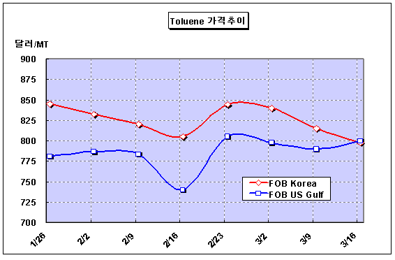 FOB Korea 797-798달러로 하락 … BP는 4월 가격 775달러 제시 톨루엔 가격은 3월16일 FOB Korea 톤당 797-798달러로 17달러 하락했다.아시아 톨루엔 시장은 중국에서 공급과잉이 표면화되고 저장탱크 부족으로 Spot 공급이 넘쳐나면서 3주째 하락세를 지속했으며, 2007년 들어 처음으로 800달러가 붕괴됐다. 다만, 중국 내수가격은 공급과잉이 극심함에도 불구하고 ex-tank 톤당 7400-7450위안에서 7400위안으로 하락하는데 그쳤다. 이에 따라 BP는 5월 거래물량 2000톤이 FOB Korea 톤당 810달러에 거래됐음에도 불구하고 4월 하순 거래가격으로 FOB Korea 톤당 775달러를 제시한 것으로 알려졌다. 국내 톨루엔 시장도 중국의 공급과잉 영향을 받아 탱크 저장용량의 80-90%가 채워져 있으며, 앞으로도 2달 동안은 저장탱크 부족을 해소하기 어려울 것으로 예상되고 있다.