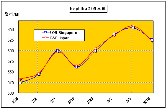 유럽은 나프타 프리미엄이 톤당 16-20달러로 상당히 높았으나 역시 정기보수가 진행되면서 수요가 줄어들어 8-12달러로 하락한 것으로 알려졌다. 표, 그래프: | Naphtha 가격추이 | <화학저널 2007/03/20> |