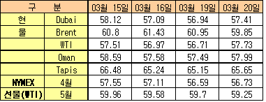 3월20일 0.47달러 올라 57.41달러 … WTI 선물은 56.73달러 불과 3월20일 국제유가는 미국의 원유 재고증가 전망과 휘발유 가격하락 영향에도 불구하고 상승했다.한국석유공사에 따르면, 뉴욕상업거래소(NYMEX)의 WTI(서부텍사스 중질유) 선물유가는 전일대비 배럴당 0.14달러 상승한 56.73달러에, ICE의 Brent 선물유가는 0.32달러 하락한 60.20달러에 거래를 마감했다. Dubai유 현물가격은 0.47달러 상승한 57.41달러를 형성했다.