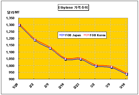 그러나 중국 공급물량이 25만-26만톤 수준으로 5만-6만톤이 남아돌아 아시아 Spot 시장에 공급될 것으로 예상되면서 아시아 에틸렌 가격이 급락하고 있다. 아시아 에틸렌 가격은 3월9일 FOB Korea 톤당 1000달러가 붕괴된데 이어 3월16일에는 940-950달러를 형성하는데 그쳤다. 한편, Tinajin LG Bohai는 LG그룹이 지분의 75%를 보유하고 있고 Tianjin LG Dagu가 10%, Tianjin Bohai Chemical이 나머지 15%를 보유하고 있다. 표, 그래프: | Ethylene 가격추이 | <화학저널 2007/03/23> |