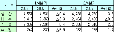 다만, 2/4분기에는 정기보수가 감소해 석유화학제품 생산량이 전년동기대비 3.3% 증가할 것으로 예상된다. 수출은 원화강세로 인한 부진과 중국수요 둔화가 지속되나, SBR 및 BR의 수출여력이 커져 2.3% 증가할 전망이다. 표, 그래프: | 석유화학 수급 전망(2007) | <화학저널 2007/03/30> |