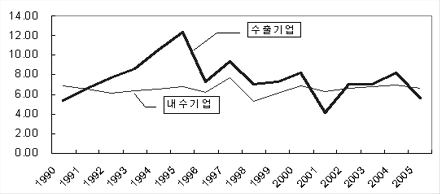 특히, 2006년 1-9월에는 수출기업의 경상이익률이 6.6%에 그친 반면, 내수기업은 8.0%로 격차가 더 벌어졌다. 수출기업의 수익성 악화 현상은 중국ㆍ일본 등과의 수출경쟁이 심화되면서 원화환율 하락에 따른 손실을 수출가격에 충분히 전가하지 못한 때문으로 분석된다. 수출기업은 매출에서 수출이 차지하는 비중이 50% 이상이고, 50% 미만이면 내수기업으로 구분한다. 표, 그래프: | 수출ㆍ내수기업의 매출액영업이익률 변화 | <화학저널 2007/04/05> |