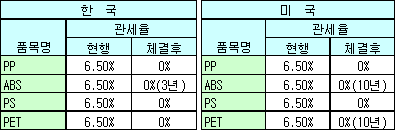 석유화학제품 중 수입관세 즉시철폐 비중은 미국이 55.2%, 한국이 50.6%로 가중평균 관세율은 미국 3.2%, 한국 5.3%로 분석되고 있다.