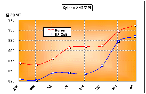 FOB Korea 962-963달러로 15달러 상승 … PTA도 860달러로 올라 M-X 가격은 4월6일 FOB Korea 톤당 962-963달러로 15달러 올랐다.아시아 M-X(Mixed-Xylene) 시장은 중국의 Polyester 시장이 호조를 보이면서 수요 증가세가 지속돼 5주 연속 900달러대 강세를 보이고 있으며, 1000달러 돌파도 가능할 것으로 예상되고 있다. Polyester 수요 호조에 따라 PTA(Purified Terephthalic Acid) 가격도 하락세를 탈피해 CFR China 톤당 880달러 수준으로 상승했고, 중국 내수가격은 톤당 8300위안으로 올랐다.