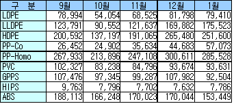 폴리올레핀 수입은 안정양상 … PVC 저조에 ABS는 감소경향 뚜렷 중국의 폴리머 수입이 올리올레핀은 안정된 양상을 보이고 있는 반면, PVC 및 ABS는 부진을 면치 못하고 있다.관세청에 따르면, 중국의 PE(Polyethylene) 수입은 LDPE(Low-Density PE)가 2004년 10-11월을 제외하고는 8만톤 안팎을 유지하고 있고, LLDPE(Linear LDPE)는 2006년 10월 일시적으로 10만톤을 밑돌았으나 11월부터 꾸준히 증가해 2007년 1월에는 17만톤을 넘었으며, HDPE(High-Density PE) 역시 10월 13만톤으로 줄었을 뿐 12월과 1월에는 25만톤을 넘어 호조를 보였다.