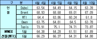 4월10일 63.39달러로 0.76달러 하락 … WTI는 61.89달러로 상승 4월10일 국제유가는 미국의 휘발유 및 난방유 재고 감소 예상에 따라 상승했다.한국석유공사에 따르면, 뉴욕상업거래소(NYMEX)의 WTI(서부텍사스 중질유) 선물유가는 전일대비 배럴당 0.38달러 상승한 61.89달러에, ICE의 Brent 선물유가는 0.83달러 상승한 67.42달러에 거래를 마감했다. 반면,Dubai유 현물가격은 0.76달러 하락한 63.39달러를 형성했다.