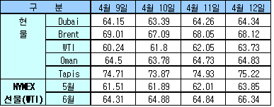 4월12일 64.34달러로 약상승 … WTI는 63.85달러로 1.84달러 급등 4월12일 국제유가는 IEA의 OPEC 감산으로 인한 주요 소비국 재고 감소 분석과 미국의 정제시설 가동중단 소식으로 상승했다.한국석유공사에 따르면, 뉴욕상업거래소(NYMEX)의 WTI(서부텍사스 중질유) 선물유가는 전일대비 배럴당 1.84달러 상승한 63.85달러에, ICE의 Brent 선물유가는 0.88달러 상승한 68.72달러에 거래를 마감했다. Dubai유 현물가격도 0.08달러 상승한 64.34달러를 형성했다.