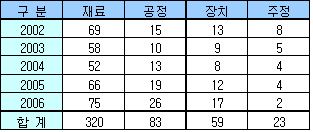 원재료는 각종 한약재나 과일류, 버섯, 해산물 등으로 다양화되고 있으며 제조공정은 숙취가 없거나 향을 개선하고 웰빙 취향에 맞는 건강증진 기능을 갖춘 출원이 주류를 이루었다. 출원인별로는 2002년 전체 105건 가운데 개인이 82건(78%), 기업이 9건(8.6%)을 차지했으나 2006년에는 120건 가운데 개인 62건(51.7%), 기업 40건(33.3%) 등으로 점차 주류 관련기업의 출원비중이 높아지고 있다. 한편, 주류 매출액은 2005년 기준 소주 2조4195억원, 맥주 3조2939억원, 위스키 4918억원(수입위스키 제외), 청주 1081억원, 약주 1363억만원 등으로 소주와 맥주가 대부분을 차지했다. 약주 및 과실주 매출비중은 3.3%에 불과해 웰빙형 술에 대한 적극적인 기술개발과 마케팅 노력이 필요한 것으로 지적된다. 표, 그래프: | 주류 기술특허 출원현황 | <화학저널 2007/04/13> |