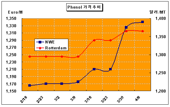 4월3일 FD NWE 톤당 1340유로로 15유로 상승 … 수급타이트 심화 페놀(Phenol) 가격이 4월3일 FD NWE 톤당 1330-1350유로로 15유로 상승했다.그러나 일부에서는 1700유로 수준에도 거래된 것으로 알려졌다. 전주에 비해 400-450유로 폭등한 수준이다. 페놀 시장은 벤젠(Benzene) 가격이 강세를 보이고 있는 상태에서 수급 불균형이 심화돼 3-4월 들어 폭등현상을 보이고 있다. 페놀 가격폭등은 유럽과 미국의 국지적 온난화 현상으로 건축용 수요가 증가하는 반면, 페놀 플랜트 트러블이 속출해 유럽과 미국 공급물량의 20%를 차지하고 있는 Ineos 및 Ertisa 플랜트가 가동에 차질을 빚고 있기 때문이다. Ineos의 17만톤 및 Ertisa의 25만톤 플랜트의 가동이 늦어져 수급타이트가 강화되고 있다. Ertisa의 Huelva 소재 페놀 25만톤 증설 플랜트는 4월말 가동 예정이나 세계적으로 공급부족이 심화돼 가격안정 효과를 가져올 수 있을지 의문시되고 있다.