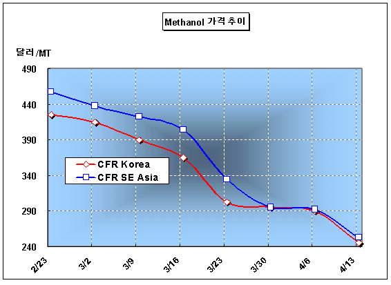 CFR Korea 245-250달러 형성 … 200달러 무너질 가능성까지 예고 메탄올 가격은 4월13일 CFR Korea 245-250달러로 45달러 하락했다.아시아 메탄올(Methanol) 시장은 추가하락을 예상한 구매자들이 시장에서 철수하면서 심각한 공급과잉 양상을 보여 2007년 들어 4개월여만에 반토막 신세를 면치 못했다. 이에 일부 메탄올 생산기업 및 무역상들은 메탄올 가격이 지나치게 하락했다고 보고 가격반등을 예상해 재고를 확대하고 있는 것으로 알려졌다. 반면, 일부 무역상들은 Methanex의 계약가격 인하 영향으로 당분간 하락세를 면치 못할 것으로 보고 재고를 대폭 축소하고 있어 앞으로의 향방이 주목되고 있다.