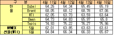 4월16일 65.19달러로 0.26달러 하락 … Brent는 1.38달러 급락 4월16일 국제유가는 나이지리아의 석유 생산재개 가능성 제기와 미국 정제시설의 일부 가동재개 소식으로 하락했다.한국석유공사에 따르면, 뉴욕상업거래소(NYMEX)의 WTI(서부텍사스 중질유) 선물유가는 전일대비 배럴당 0.02달러 하락한 63.61달러에, ICE의 Brent 선물유가는 1.38달러 하락한 67.25달러에 거래를 마감했다. Dubai유 현물가격도 0.26달러 하락한 65.19달러를 형성했다.