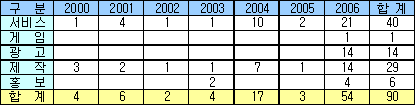 매개체 분류는 Text, Audio, Image, Video, Hyper Packaged(Text+Image 또는 Audio+Video) 등이 존재하며, 제작목적별로는 E-UCC, I-UCC, B-UCC 등이 있다. E-UCC(Entertainment UCC)는 제작목적이 흥미와 재미에 있는 것으로 현존하는 UCC의 70-80%가 E-UCC이며, I-UCC(Information UCC)는 자신의 정보를 공유하고 나누기 위해 만든 것으로 대표적인 것이 지식검색이고, B-UCC(Business UCC)는 I-UCC에 수익모델이 결합된 형태로 정보를 대가성 교환을 통해 공유하는 것이다. 표, 그래프: | UCC 기술특허 출원동향 | <화학저널 2007/04/17> |