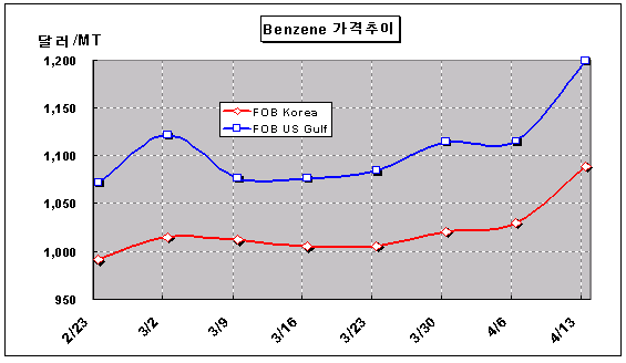 FOB Korea 1088-1090달러 형성 … 미국은 1200달러로 폭등 벤젠 가격은 4월13일 FOB Korea 톤당 1089달러로 무려 60달러 폭등했다.아시아 벤젠(Benzene) 시장은 국제유가가 Dubai유 기준 배럴당 65달러 안팎으로 초강세를 지속한 상태에서 미국수출까지 증가세를 보이면서 17주 동안 최고수준으로 상승했다. 아시아는 PS(Polystyrene) 및 ABS(Acrylonitrile Butadiene Styrene) 수요시즌이 도래함에 따라 SM(Styrene Monomer) 가격이 급등하면서 벤젠 가격승승을 이끌었다. 여기에 미국의 휘발유 소비시즌이 도래하면서 휘발유 블렌딩용 톨루엔(Toluene) 수요가 증가하고 벤젠 생산이 줄어들어 미국에 대한 벤젠 수출도 증가하는 양상을 보이고 있다.