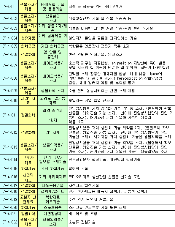 공급기술조사 관련 신청서식은 한국발명진흥회(www.kipa.org)나 특허기술거래시스템(www.ipmart.or.kr) 홈페이지를 통해 다운로드 받을 수 있고, 자세한 사항은 한국발명진흥회 특허기술평가팀(02-3459-2888-9)으로 문의하면 된다. 표, 그래프: | 화학ㆍ섬유 분야 수요기술 목록 | <화학저널 2007/04/19> |