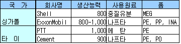 시장은 중국, 원료 공급은 중동으로 국한된 형태에서 IMF 위기 당시 위기를 맞았던 것이 동남아시아 국가들이 석유화학사업에 적극 투자하는 2대 요인으로 꼽히고 있어 앞으로의 추이가 주목되고 있다. 표, 그래프: | 싱가폴 및 타이의 석유화학 프로젝트 | <화학저널 2007/04/20> |