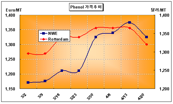 FOB Rotterdam 1315-1325달러 형성 … Cumene 공급부족은 지속 페놀 가격은 4월 3째주에 FD NWE 톤당 1310-1340유로로 50유로 하락했다.유럽 페놀(Phenol) 시장은 3월 이후 가격이 상승세를 지속해 수요기업들의 코스트 부담이 가중되면서 구매수요가 줄어들자 하락세로 전환됐다.