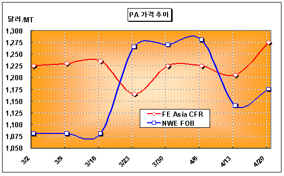 아시아의 PA 생산기업들은 수요가 호조를 보이고 있는 중국시장 공급에 초점을 맞추고 있는데, 중국 수요가 약세를 보이지 않는 한 다른 지역에서는 구매난이 지속될 것으로 계상되고 있다. 표, 그래프: | PA 가격추이 | <화학저널 2007/04/27> |