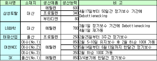 삼성토탈, 4월 50일간 가동중단 … 여천NCC도 5월 정기보수 실시 국내 에틸렌(Ethylene) 시장의 수급타이트가 6월 하순까지 지속될 전망이다.삼성토탈의 대산 소재 에틸렌 60만톤 크래커가 4월17일부터 정기보수를 실시하고, 여천NCC의 여수 소재 에틸렌 No.2 52만톤 크래커도 5월14일부터 한달간 정기보수를 실시할 예정이기 때문이다. 여천NCC의 No.1 85만톤 크래커는 2월 5-10일 유지보수를 실시한 것으로 알려졌다. LG화학의 대산 소재 48만톤 크래커는 30만톤을 증설한 후 4월 7-8일 70% 수준의 가동률을 기록한 것으로 알려졌다. SK는 울산 소재 85만톤 크래커를 3/4분기에 한달간 정기보수를 실시할 예정이다.