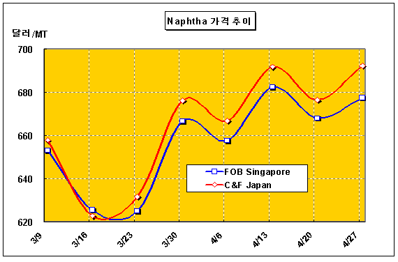 한편, 유럽의 나프타 가격은 4월27일 CIF NWE 톤당 672달러로 4달러 이상 상승했다. 그러나 유럽에서는 나프타 가격이 지나치게 강세를 나타내자 나프타를 LPG로 대체 사용하려는 움직임을 보여 상승세가 제한되고 있다. 표, 그래프: | Naphtha 가격추이 | <화학저널 2007/04/30> |