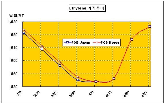 FOB Korea 1000-1010달러 형성 … CPC 23만톤 트러블로 수급타이트 에틸렌 가격은 4월 4째주 FOB Korea 톤당 1000-1010달러로 40달러 상승했다.아시아 에틸렌(Ethylene) 시장은 한국과 인도네시아의 크래커 정기보수와 타이완의 가동중단 영향으로 수급타이트가 심화돼 835달러로 폭락한지 3주만에 1000달러를 재돌파했다. 일본 무역상사들이 공급하는 Spot 물량이 부족해 가격급등에 영향을 미쳤다. 타이완 CPC의 Lin Yuan 소재 에틸렌 No.3 23만톤 크래커가 기계적 트러블을 일으켜 4월16일 재가동했으나 가동률이 70-80%에 불과하기 때문이다. No.3 크래커는 11월 또는 12월 40일간 정기보수를 실시할 예정이어서 당분간 가동을 중단할 계획은 없는 것으로 알려졌다. CPC는 No.3 크래커의 가동차질을 커버하기 위해 Lin Yuan 소재 No.4 38만톤 및 Kaohsiung 소재 No.5 45만톤 크래커의 가동률을 90%에서 100%로 끌어올린 것으로 알려졌다.