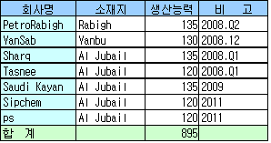 한편, 사우디는 에틸렌 생산능력 확장에 맞춰 PE(Polyethylene), EG(Ethylene Glycol) 등 유도제품을 생산해 세계시장에 수출할 계획이어서 큰 파장이 예상된다. 중동지역에서는 2008년부터 2010년 전후에 걸쳐 이란, 카타르의 2대 천연가스 보유국을 중심으로 에틸렌 프로젝트 완료가 속출해 세계 석유화학 수급밸런스에 큰 영향을 미칠 것으로 전망되고 있다. 표, 그래프: | 사우디의 에틸렌 프로젝트(2009-11) | <화학저널 2007/05/4> |