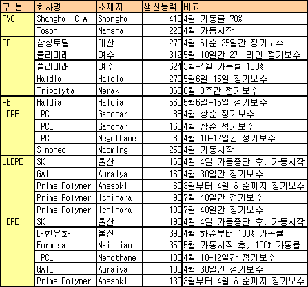 삼성토탈 PP 27만톤 4-5월 … 폴리미래도 31만톤 2라인 5월에 아시아의 합성수지 플랜트 정기보수가 4-7월에 집중돼 수급이 타이트해질 전망이다.PP(Polypropylene)는 삼성토탈이 대산 소재 27만톤 플랜트를 4월 하순부터 25일간 정기보수할 예정이며, 폴리미래는 5월 여수 소재 31만톤 2개 라인의 정기보수를 실시할 것으로 알려졌다. Haldia Petrochemical은 Haldia 소재 PP 27만톤 플랜트를 4월 하순부터 25일간 정기보수하고, Tripolyta도 Merak 소재 36만톤 플랜트를 6월 3주간 정기보수할 예정이다. PE(Polyethylene)는 SK가 울산 소재 LDPE(Linear Low-Density PE) 16만톤 플랜트와 HDPE(High-Density PE) 19만톤 플랜트를 4월14일 크래커 트러블로 일시 가동을 중단한 후 현재 가동을 시작한 것으로 알려졌다. IPCL은 Gandhar 소재 LDPE(Low-Density PE) 8만5000톤과 16만톤 플랜트를 4월 상순 정기보수를 실시한 것으로 알려졌다.