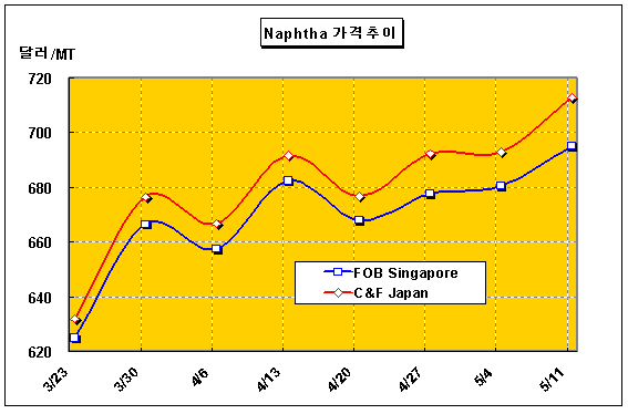 C&F Japan 710-715달러로 20달러 상승 … 유럽시장도 수급타이트 나프타 가격이 5월 둘째주에 C&F Japan 톤당 713달러를 형성했다.아시아 나프타(Naphtha) 시장은 에틸렌(Ethylene) 크래커 신증설이 홍수를 이루면서 수요가 급증해 수급타이트가 강화됨으로써 710달러를 돌파하며 사상 최고기록을 세웠다. 특히, 유럽에서 휘발유 블렌딩용 나프타 수요가 호조를 보이면서 아시아 수출이 제한되고 있어 700달러대의 강세가 당분간 지속될 것으로 예상된다. 유럽의 나프타 가격도 699달러로 24달러 상승했는데, 유럽가격이 20-30일 후에는 아시아 시장에 영향을 미친다는 점에서 추가상승 가능성도 나타나고 있다.